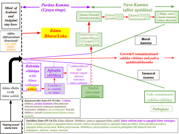Quá trình dính mắc tuần tự (và rất nhanh) này được thảo luận chi tiết trong nhiều bài viết, bài gần nhất là “Purāṇa and Nava Kamma – Sequence of Kamma Generation.”